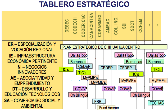 Un ejercicio que puede facilitar el entendimiento necesario e inclusive identificar oportunidades concretas de colaboración interinstitucional es a través de la integración de lo que hemos llamado el Tablero Estratégico. Éste consiste de una matriz cuyas columnas representan cada una de las instituciones con las que haya interés en colaborar. Los renglones corresponden a las diferentes áreas de acción. En nuestro caso, estas áreas de acción resultaron de un proceso de prospectiva estratégica y las denominamos Ejes Estratégicos de Acción. Estos Ejes Estratégicos representan un conjunto completo en el cual pueden encontrar su lugar los programas y acciones de las diferentes instituciones, incluyendo obviamente los correspondientes al proceso de clusterización.