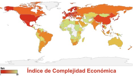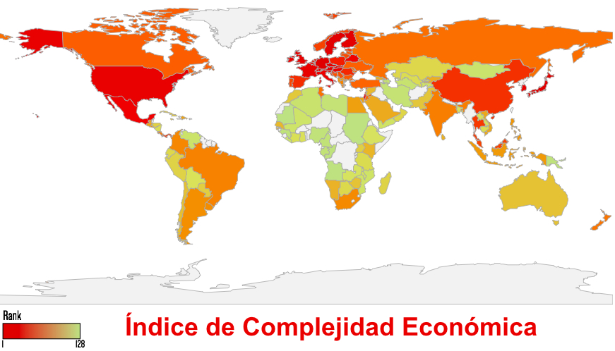 Recientemente se publicó un estudio que presenta los resultados de un nuevo enfoque a partir de lo que se denomina Complejidad Económica (“The Atlas of Economic Complexity: Mapping paths to prosperity”, disponible en http://atlas.media.mit.edu/). Es el resultado de varios años de trabajo de un grupo encabezado por Ricardo Haussman, del Centro de Desarrollo Internacional de la Universidad de Harvard, y César Hidalgo, del MediaLab del Instituto Tecnológico de Massachusetts. Los resultados de la aplicación de esta metodología a 128 países se presentan en la figura siguiente, en la que los países con un mayor Índice de Complejidad Económica aparecen con un color rojo más intenso.