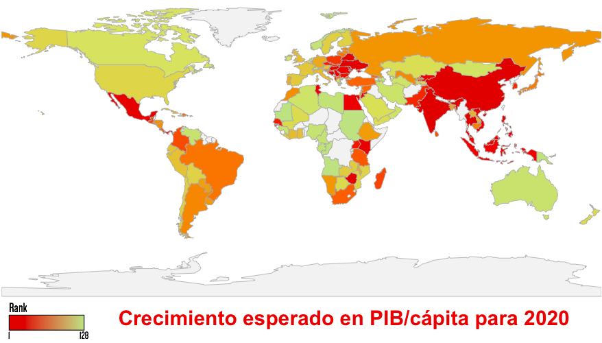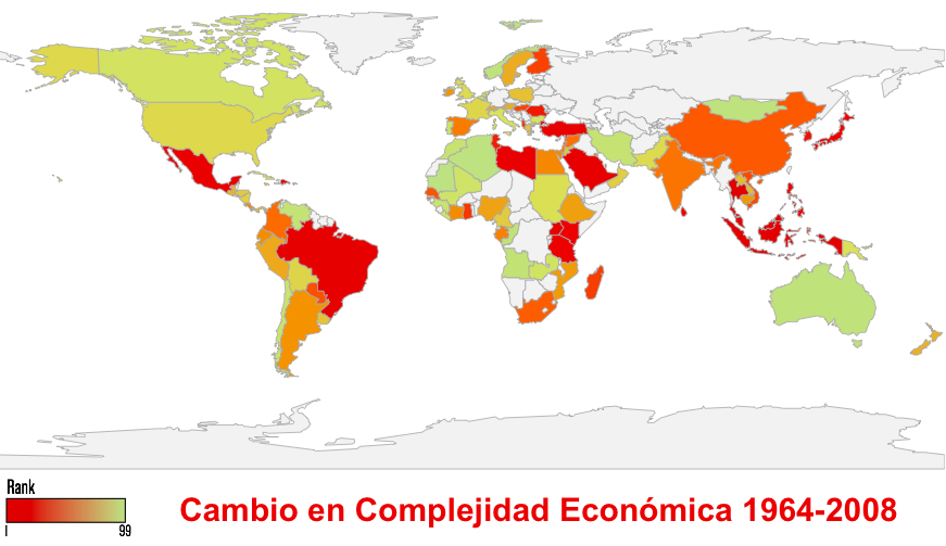 Recientemente se publicó un estudio que presenta los resultados de un nuevo enfoque a partir de lo que se denomina Complejidad Económica (“The Atlas of Economic Complexity: Mapping paths to prosperity”, disponible en http://atlas.media.mit.edu/). Es el resultado de varios años de trabajo de un grupo encabezado por Ricardo Haussman, del Centro de Desarrollo Internacional de la Universidad de Harvard, y César Hidalgo, del MediaLab del Instituto Tecnológico de Massachusetts. Los resultados de la aplicación de esta metodología a 128 países se presentan en la figura siguiente, en la que los países con un mayor Índice de Complejidad Económica aparecen con un color rojo más intenso.